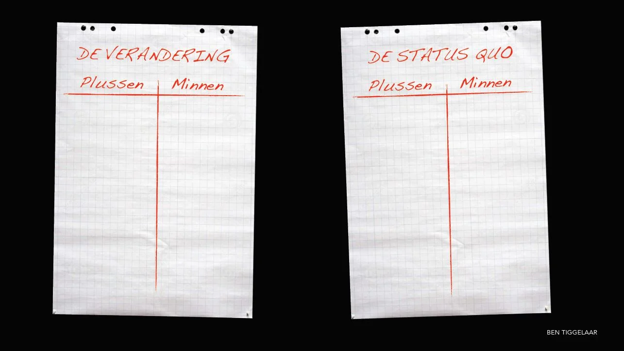 Maak gebruik van onze hekel aan verlies. Ons brein reageert sterker op ongemak, pijn en verlies dan op gemak, plezier en winst. Oftewel: bad is stronger than good, zegt hoogleraar psychologie Roy .F. Baumeister. Probeer het maar eens uit. Vul met je team deze afbeelding in op een whiteboard of flap. In kolommen 1 en 2 laat je de status quo of geen verandering invullen. Kolom 1 voor de voordelen en kolom 2 voor de nadelen. Kolom 3 en 4 gaan over wel verandering. Kolom 3 voor de voordelen en kolom 4 voor de nadelen. Na het invullen voel je de urgentie, of niet. Als er niet voldoende urgentie is? Wat doe je dan? Niks, óf: